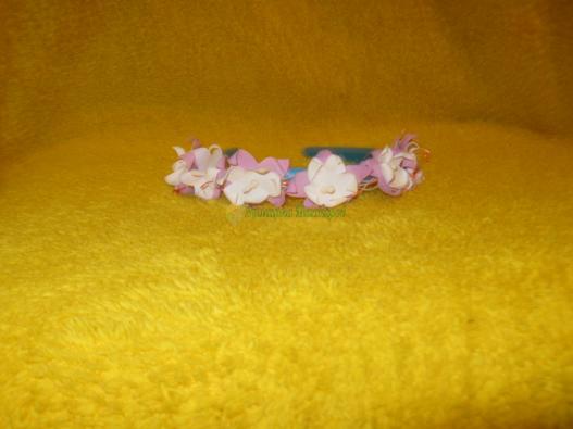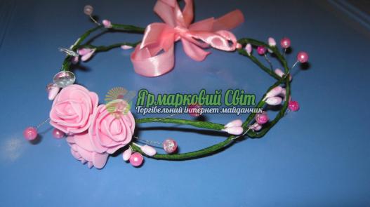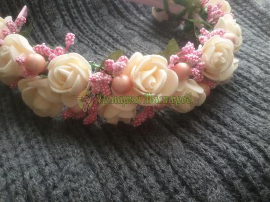 Венок выполнен в нежно-розовых тонах. Обруч мягкий
